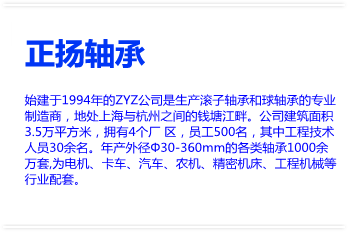 始建于1994年的ZYZ公司是生產(chǎn)滾子軸承和球軸承的專業(yè)制造商,地處上海與杭州之間的錢塘江畔。公司建筑面積3.5萬平方米,擁有4個(gè)廠?區(qū),員工500名,其中工程技術(shù)人員30余名。年產(chǎn)外徑Φ30-360mm的各類軸承1000余萬套,為電機(jī)、卡車、汽車、農(nóng)機(jī)、精密機(jī)床、工程機(jī)械等行業(yè)配套。